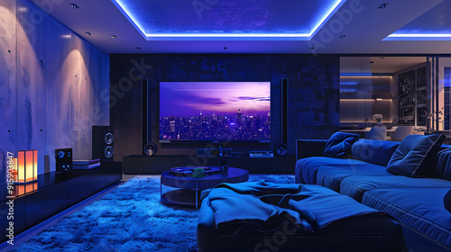 Automated Home Entertainment Systems, automated home entertainment systems showing integrated audiovisual equipment, such as smart TVs, speakers, and streaming devices design