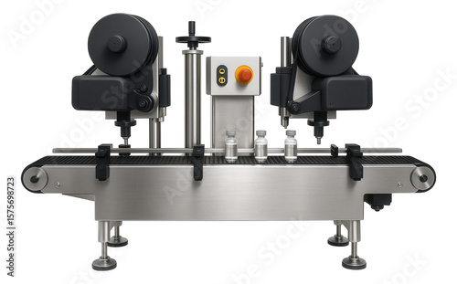 Automated labeling line with precision applicators for pharmaceutical packaging.