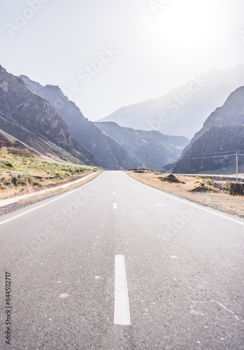 Automobile asphalt road in the mountains in the valley between rocky mountains, Pamir Highway in Tajikistan