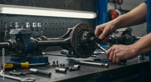 Automotive Axle Repair: Precision and Expertise - Skilled hands meticulously repair a car axle, showcasing automotive repair expertise. Precision tools, organized workspace