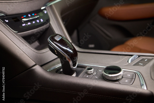 Automotive gear overview, Urban inspired vehicle interior showing gear shift and control features, Detailed shot of car gear selector with glossy knob and water droplets