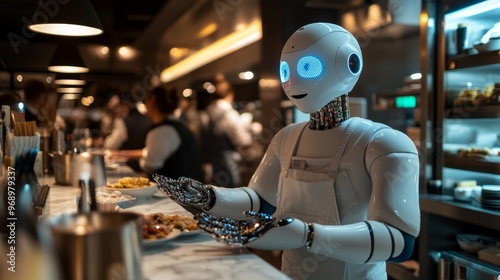 service, hospitality, industry, dining, robotic, eatery, robot, automation, client, automated, epicure, interaction, team, culinary, waiter, development, goggles, room, server, android, wine, futuristic, future, luxury, artificial, salad, presentation, technology, observing, food, high, fine, smart, innovation, life events, table, meal, atmosphere, elegant, mock, intelligence, modern, working, tech, concept
