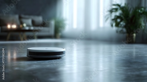 autonomous, robot, vacuum, cleaner, modern, minimalist, living, room, floor, cleaning, sweeping, working, operating, moving, gliding, concrete, interior, home, space, furniture, sofa, couch, table, plant, potted, greenery, candle, light, lamp, clean, tidy, neat, organised, quiet, calm, serene, roomy, futuristic, smart, tech, technology, automation, efficiency, convenience, sharpened, texture, surface, reflections, indoor