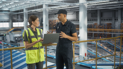 man, caucasian, laptop, computer, teamwork, warehouse, center, logistic, transportation, distribution, conveyer belt, conveyer, shipping, delivery, sorting, cardboard box, box, worldwide, facility, autonomous, automation, automated, fulfillment, specialist, colleague, package, product, good, manage, retail, inventory, distribute, stock, storage, business, industrial, assembly, carrier, factory, freight, futuristic, shipment, men at work, manager, associate, storehouse, supervisor