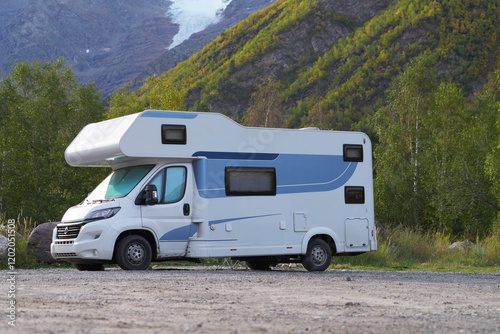 motorhome, camping, mountain, car, van, caravanning, trip, travel, parking, overnight, stop, mountain, scenic, nature, landscape, relief, autumn, snowy, snow, peak, camper, rent, glade, way, route, transport, vehicle, copy space, tour tourism