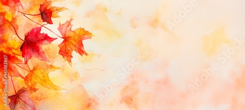 Autumn background with watercolor red and orange leaves on a light yellow background, a beautiful fall season wallpaper design for digital art., copy space for text