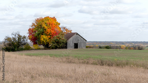 Autumn Barn in Field, Colorful Tree, Rolling Hills Background, Fall Landscape Photography