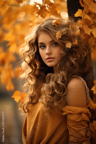 woman, autumn, leaf, gold, beauty, curly, hair, nature, forest, fall, portrait, female, outdoors, seasonal, serene, fashion, elegance, coiffure, foliage, tree, environment, tranquil, young, adult, caucasian, style, chic, trendy, model, majestic, aethereal, dreamy, vibrant, colours, calm, peaceful, youth, grace, aesthetic, fairy tale, whimsy, mystical, enchantment, ambience, allure