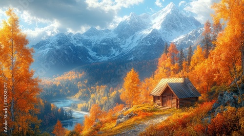 Autumn Cabin in Serene Mountains with Vibrant Trees and Golden Hour Light
