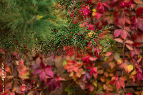 Autumn colors. Early leaves of ornamental grapes. Selective focus.