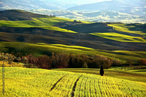 landscape, field, nature, sky, green, meadow, grass, agriculture, countryside, mountain, summer, blue, rural, hill, spring, tuscany, view, land, farm, beautiful, country, italy, tree, cloud, panorama