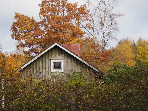 house, autumn, bungalow, sky, rural, landscape, country, building, tree, barn, home, nature, farm, countryside, blue, grass, architecture, fall, wood, tree, forest, red, village, finland, green