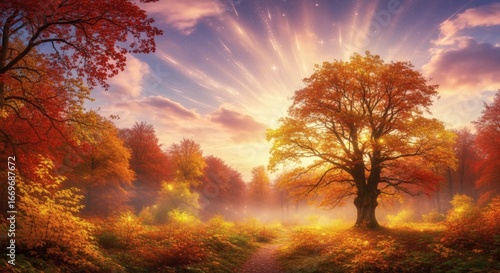 Autumn countryside road surrounded by vibrant fall trees with red and golden foliage