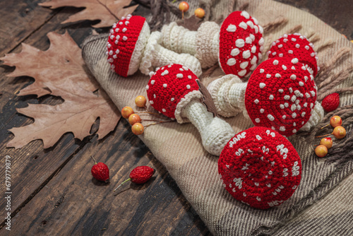 Autumn cozy mood composition. Crocheted amanita mushroom, handmade, fall hobby concept