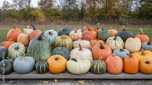 Autumn display of pumpkins in various shapes and sizes, perfect for seasonal decor and fall festivities.