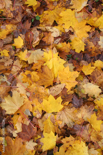 Autumn foliage background. Fallen yellow and brown Maple tree leaves