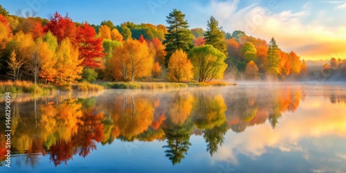 Autumn foliage on lake shore at dawn with misty atmosphere and reflections of vibrant orange yellow green trees