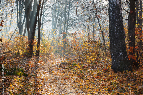 Autumn Forest frosty sunny morning. Landscape. Nature