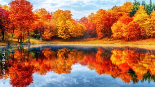 autumn, forest, lake, tree, water, sky, cloud, foliage, vibrant, colourful, colours, red, orange, yellow, green, blue, nature, landscape, scenic, peaceful, tranquil, serene, beauty, season, fall, timberland, wood, park, outdoors, natural, wilderness, picturesque, still, mirror, mirrored, inverted, upside down, horizon, shoreline, edge, bank