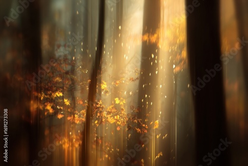 Autumn forest scene with golden leaves illuminated by soft sunlight filtering through tall trees, creating a serene and tranquil atmosphere in nature's embrace