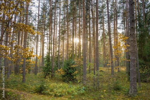 Autumn forest scenery with rays of warm light illumining the gold foliage