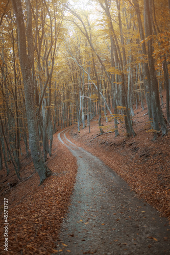 Autumn forest scenery with road of fall leaves, warm light illumining the gold foliage. Footpath in scene autumn forest nature. Vivid october day in colorful forest.