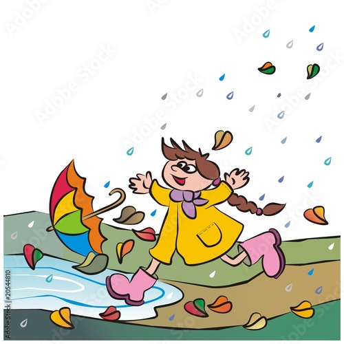 girl, autumn, rain, umbrella, wellington, pool, leaf, illustration