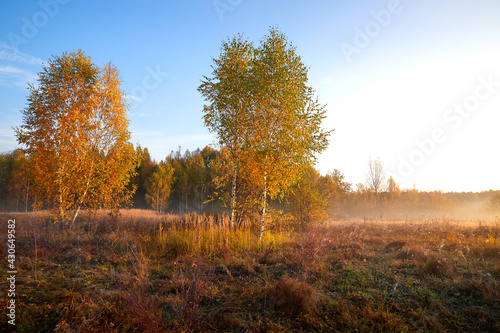 Autumn golden forest. Park recreation area. Autumn in Russia. Sunny day.