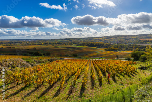 vinery, autumn, fall, grapevine, wine, row, agriculture, landscape, countryside, rural, panorama, season, sky, cloud, french, france, burgundy, vine-growing, vinification, harvest, gold, yellow, red, field, plant, farming, nature, outdoors