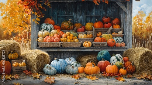 autumn, harvest, pumpkin, gourd, fall, racked, rustic, hay, bale, leaf, orange, yellow, green, blue, grey, white, colours, wooden, crate, basket, display, seasonal, october, november, thanksgiving, farm, country, countryside, nature, outdoors, sunlight, shadow, painting, artwork, art, image, picture, photograph, still, life, composition, vibrant, colourful, beauty
