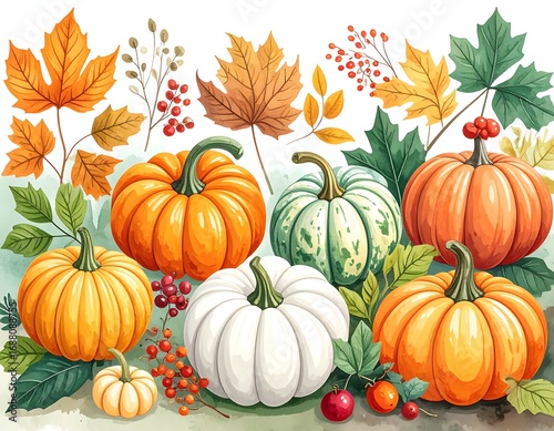 pumpkin, autumn, fall, harvest, leaf, berry, gourd, orange, white, green, nature, seasonal, illustration, vibrant, colourful, decorative, design, background, foliage, thanksgiving