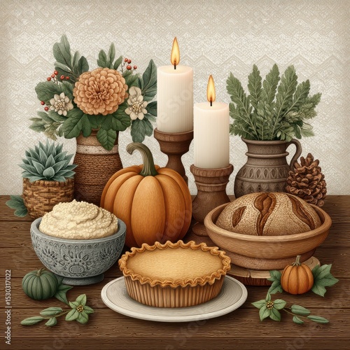 autumn, harvest, thanksgiving, still life, candle, pumpkin, pie, bread, flower, table, wooden, rustic, warm, cosy, fall, seasonal, food, dessert, floral arrangement, home decor, vintage, retro, illustration, digital artwork, artwork, creamy, epicure, candlelight, earth-tone, orange, brown, beige, green, white, fall harvest, table setting, homely, autumn, natural, traditional