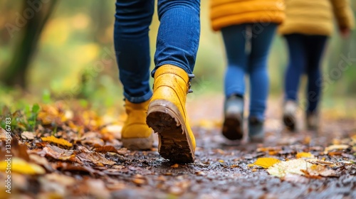 hiking, autumn, fall, nature, walk, leaf, forest, wood, yellow, boot, family, trail, path, adventure, scenic, landscape, travel, exploration, journey, season, colourful, tree, mud, ground, leg, people, group, clothing, jean, jacket, shoe, footwear, weather, wet, day, relaxed, tranquil, peaceful, serene