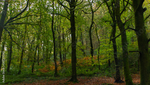 Autumn in an ancient Cornish woodland forrest, with bright green brown and many other autumnal colours.