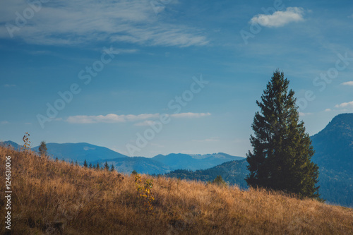 Autumn in the Carpathian mountains. Big fir on mountains and sky background