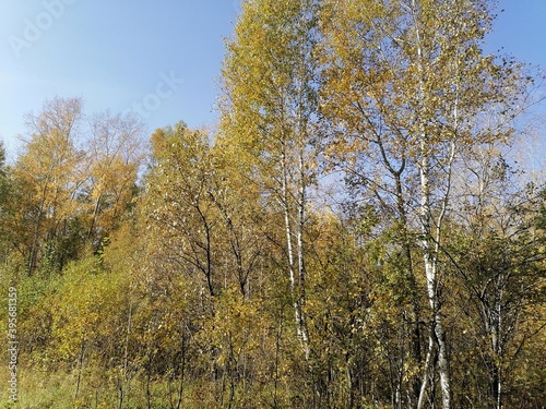 autumn, tree, forest, nature, landscape, fall, tree, sky, yellow, leaf, birch, season, leaf, blue, green, foliage, park, wood, wood, aspen, grass, colours, outdoors, sun, gold