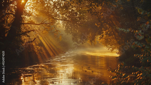 Autumn in the forest, sun shines over the river, gold leaves are falling from the trees