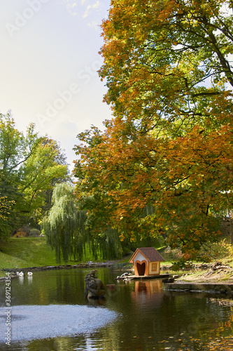 autumn in the park,maple tree in autumn on the lake in the park with a wooden house for birds