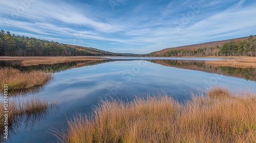 Autumn Lake Reflection: Calm Water, Blue Sky, and Golden Reeds
