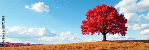 Autumn landscape with Northern Red Oak trees against blue sky, oak tree, blue sky