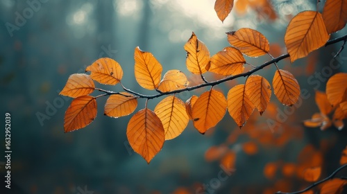 Autumn leaves branch, misty forest background, nature photography, seasonal design