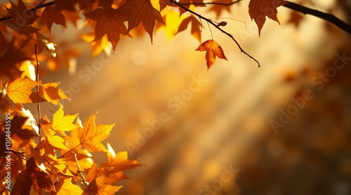 Autumn leaves illuminated by warm sunlight, creating a serene, golden atmosphere with vibrant orange, yellow, and red hues