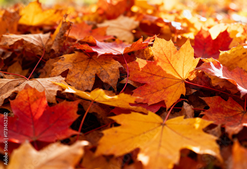 Autumn leaves in vibrant colors scattered on the ground.