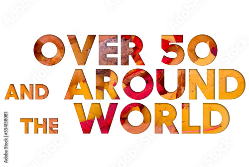 Autumn leaves, objects with Over 50 and around the world text. Natural patterns, color design.