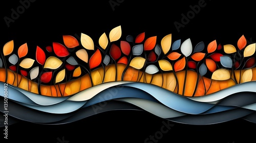 autumn, leaf, fall, foliage, tree, craft, design, abstract, landscape, nature, background, illustration, artwork, vibrant, colourful, orange, red, yellow, blue, black, seamless, pattern, texture, wallpaper, banner, card, invitation, decoration, art, graphic, design element, template, digital artwork, vector, autumn, season, stylised, training, nourishment, finance