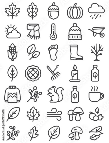 leaf, nature, pumpkin, vector, autumn, season, tree, outline, acorn, boot, clothing, illustration, honey, jar, mushroom, september, symbol, festival, fire, rain, weather, wind, calendar, october, squirrel, umbrella, apple, maple, rake, set, fall, icon, line, object, pie, signs, sweater, thin, food, garden, autumn color, concept, cut-out, education, harvest, idea