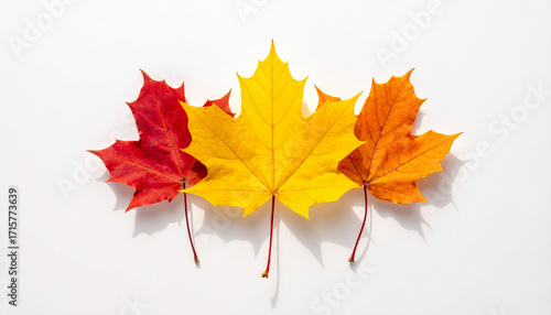 maple, leaf, autumn, fall, season, red, yellow, orange, colours, white, background, isolated, three, group, plant, nature, flora, flat, lay, overhead, view, simple, clean, minimalism, vibrant, bright, colourful, seasonal, change, pattern, design, decor, holiday, thanksgiving, natural, object, studio, shot, organic, botanical, foliage