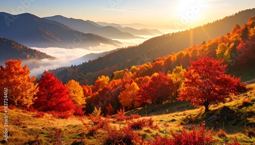 autumn, fall, mountain, landscape, mist, fog, vale, tree, forest, foliage, sunrise, sunset, golden hour, scenic, nature, outdoors, environment, hillside, timberland, colourful, vibrant, serene, peaceful, tranquil, idylli, sunlight, sky, horizon, aerial view, panorama, vista, countryside, rural, travel, destination, tour tourism, seasonal, orange, red, yellow, leaf, meadow, grass, sun ray, atmospheric, bright, dreamy, soft light