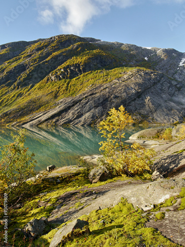autumn, norge, mountain, calm, tree, lake, season, fall, water, nature, nordic, landscape, sky, cloud, rock, stone, vale