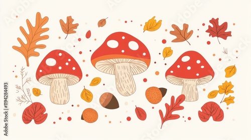 autumn, mushroom, leaf, design, illustration, decor, fall, nature, colourful, background, element, vector, art, graphic, decorative, simple, autumn, cute, mushroom, botanical, floral, pattern, image, red, orange, acorn, texture, flat, element, creative